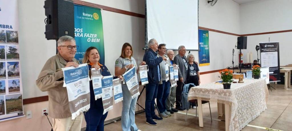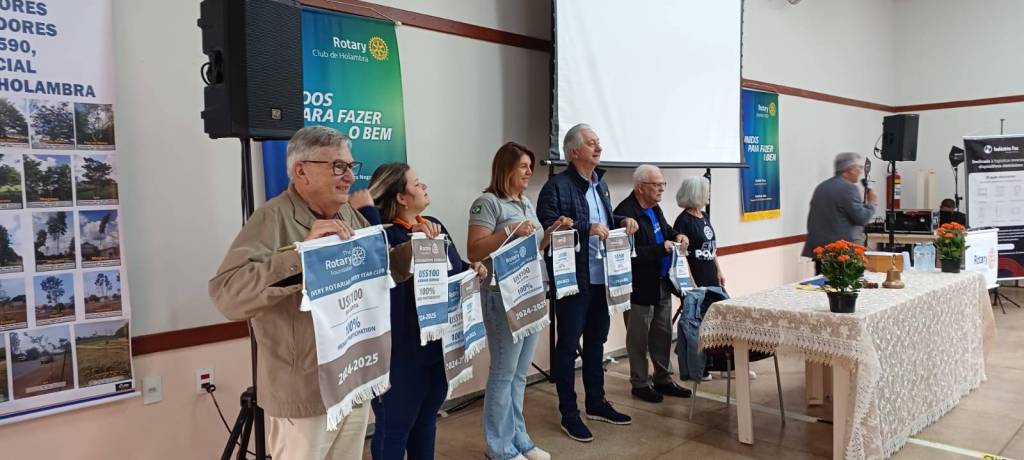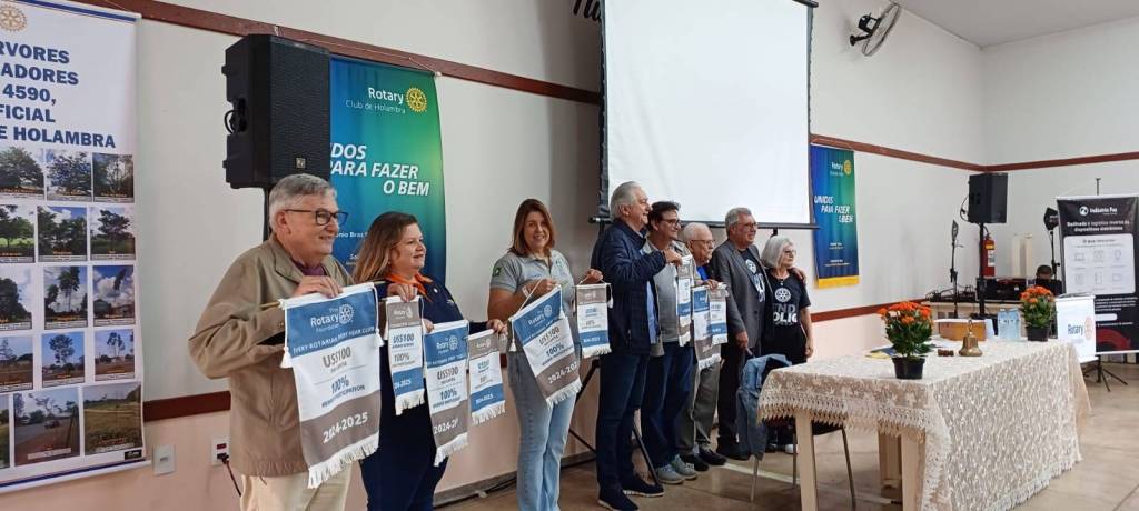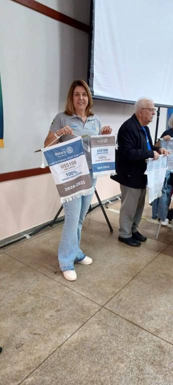 Ainda tivemos o reconhecimentos referente as doações para Fundação Rotaria, ano 2024-25, onde nosso Clube ficou em 2º lugar de todo D4590, em doação para fundação rotaria, tambem ganhamos pela quinta vez, consecutiva, como clube 100% Erey e 100% dos companheiros que fizeram doação para FR.